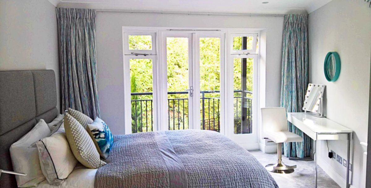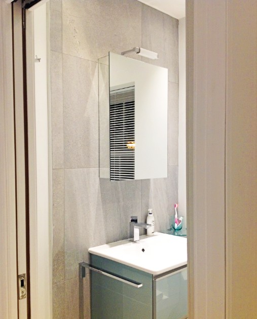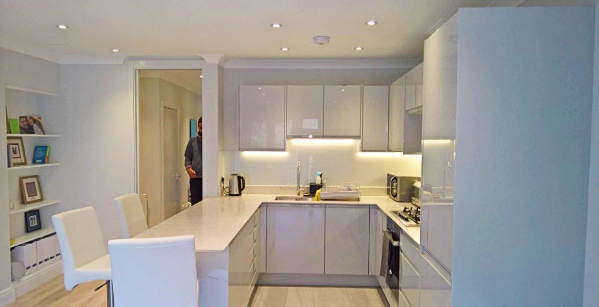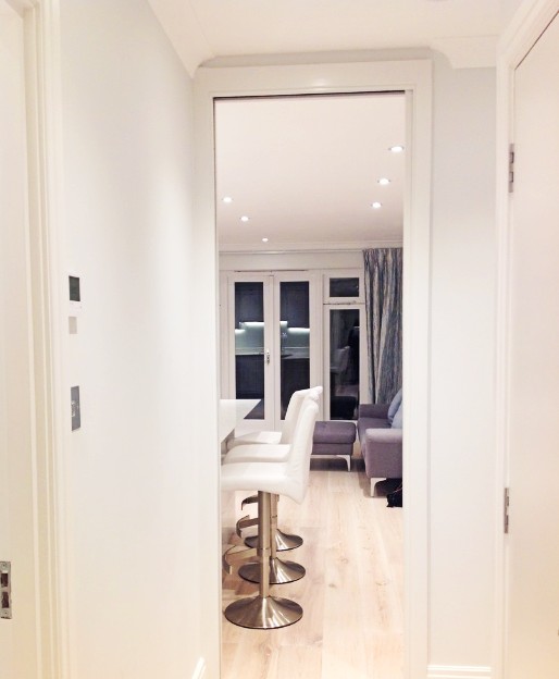 Total refurbishment of apartment overlooking the gardens. The client required a “new build” finish. Walls were removed creating more space to create an open plan kitchen/diner. The client required bed and desk space in the compact bedroom 2 so a desk/bed with a single bed above suspended on steps with storage on one side and a wardrobe on the other
